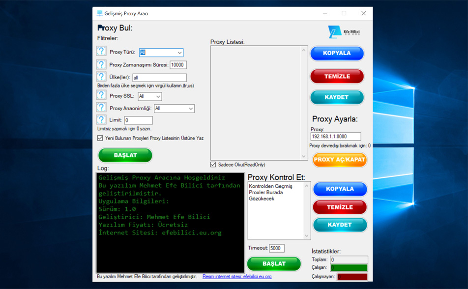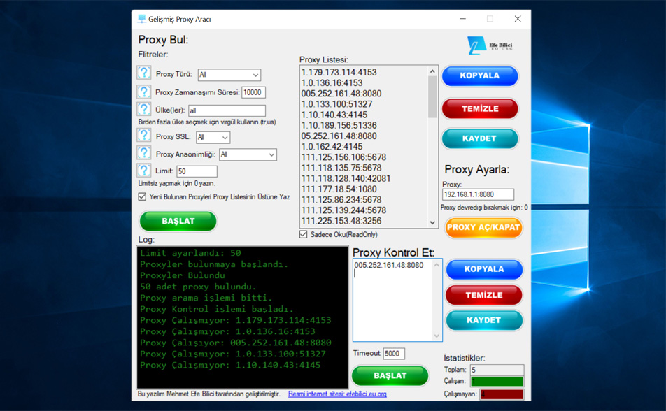 Proxy kontrol özelliği ile bulduğunuz proxyleri veya kendi proxylerinizi toplu halde kontrol edebilirsiniz. Kontrol edilen proxyleri kopyalayabilir veya kaydedebilirsiniz.